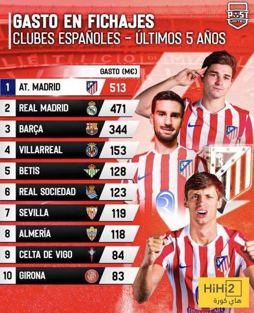 وتكشف هذه الأرقام عن تغيّر واضح في خريطة إنفاق الأندية الإسبانية، حيث لم يكن العملاقان ريال مدريد وبرشلونة في صدارة القائمة، ما يبرز طموحات أتلتيكو مدريد في تعزيز صفوفه بقوة خلال السنوات الأخيرة.