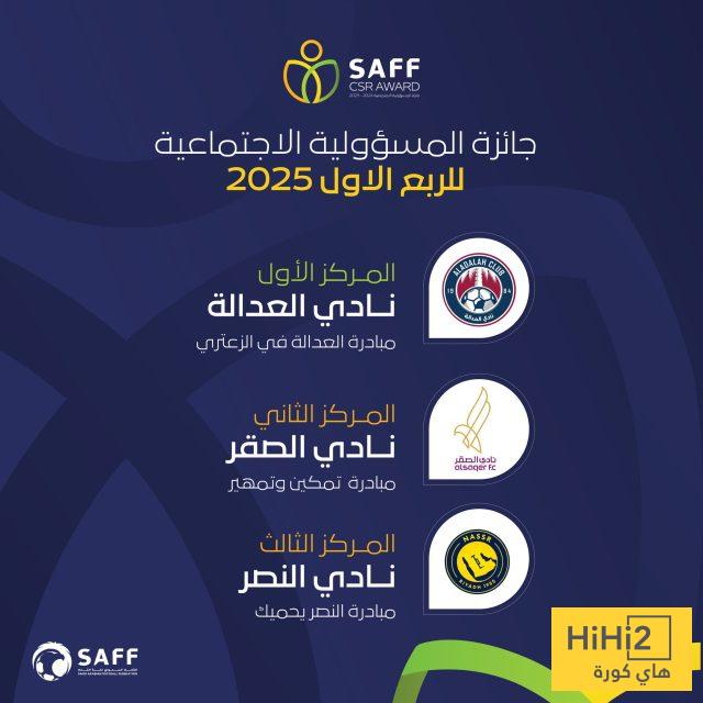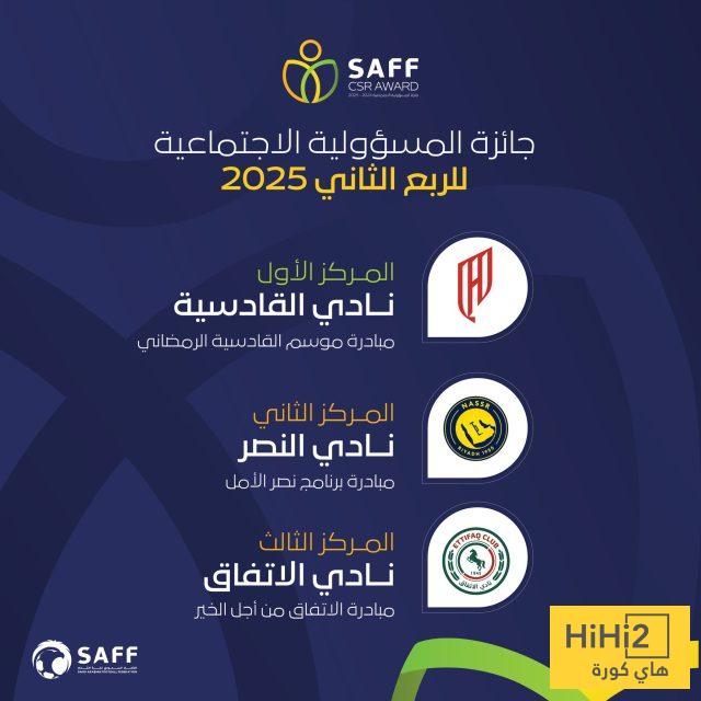 هاي كورة – أعلن الاتحاد السعودي لكرة القدم نتائج جائزة المسؤولية الاجتماعية للأندية عن الربعين الأول والثاني لعام 2025، حيث واصل النصر حضوره المميز بتحقيقه المركزين الثالث والثاني، عبر مبادرات نوعية تعكس التزامه بدوره المجتمعي.