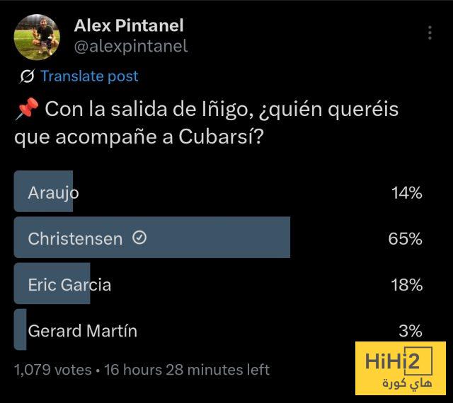 هاي كورة – أجرى الصحفي الكتالوني أليكس بينتانيل استفتاءً عبر حسابه الرسمي على منصة إكس، لمعرفة رأي جماهير نادي برشلونة حول أفضل مدافع ليكون بديلاً لإينيغو مارتينيز بعد رحيله عن الفريق في فترة الانتقالات الصيفية الحالية.