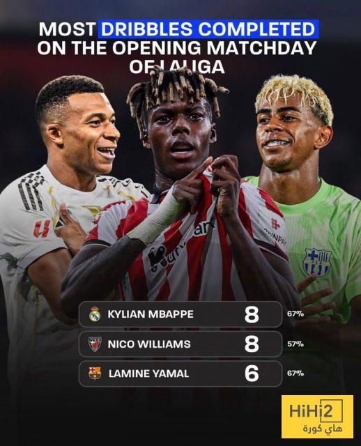 هاي كورة- تصدر نجم ريال مدريد، كيليان مبابي، قائمة المراوغات في الجولة الافتتاحية من الدوري الإسباني برصيد 8 مراوغات، متساويًا مع اللاعب نيكو ويليامز.
