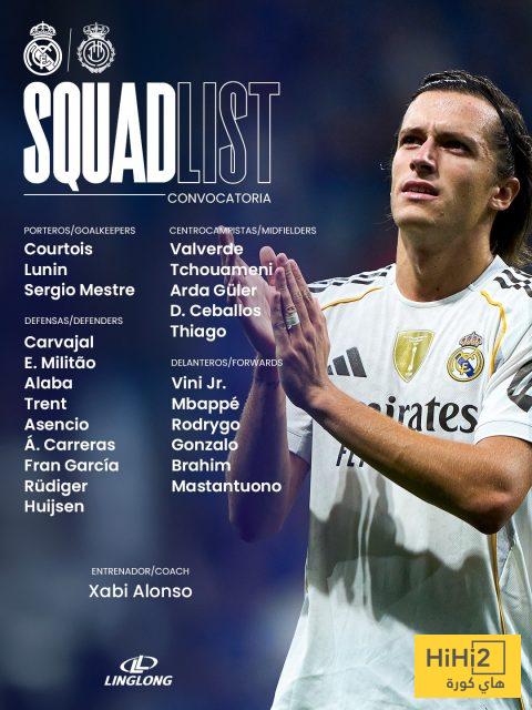 هاي كورة – أعلن المدرب الإسباني تشابي ألونسو، عن قائمة ريال مدريد الرسمية، لمواجهة مايوركا، غدًا السبت، على ملعب سانتياغو برنابيو، ضمن منافسات الجولة الثالثة من بطولة الدوري الاسباني.