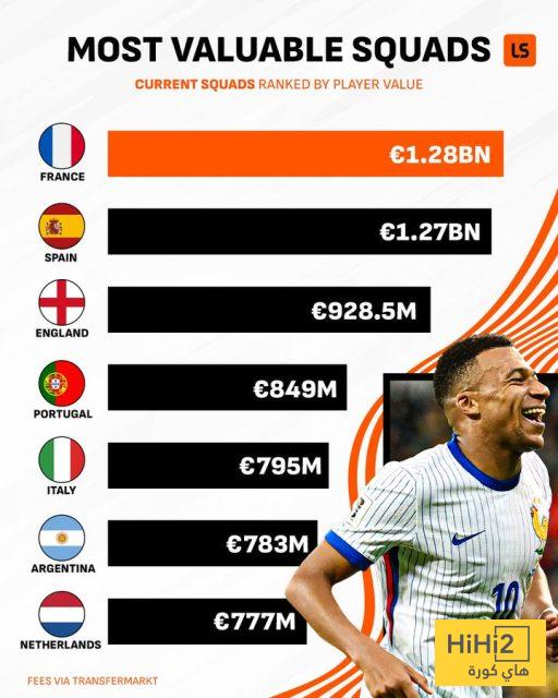 وبحسب قائمة ترانسفير ماركت لأعلى 7 منتخبات قيمة في الوقت الحالي، جاء وصيف العالم على رأس القائمة بـ1.28 مليار يورو، بينما حل منتخب إسبانيا في المركز الثاني بـ1.27 مليار يورو، وجاء المنتخب الإنجليزي بالمركز الثالث بـ928.5 مليار يورو.