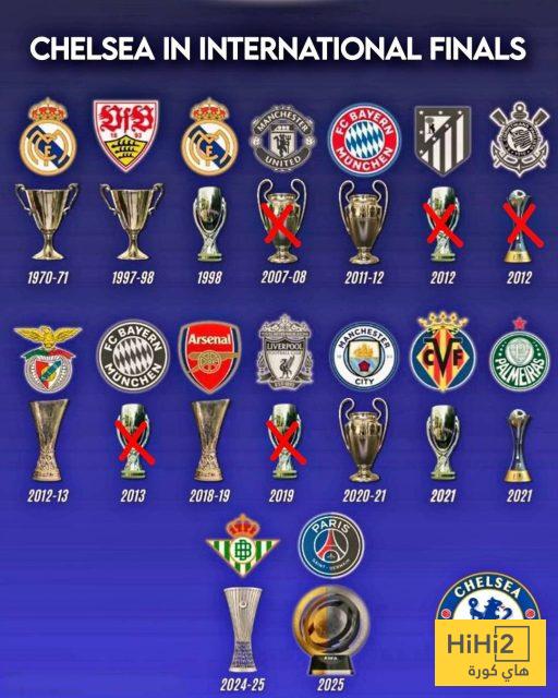 تشيلسي فاز ب10 نهائيات و لم يخسر سوى 5 نهائيات منذ اول نهائي له و كان ضد ريال مدريد في كاس اوروبا لأبطال الكؤوس عام 1971 و حتى نهائي دوري المؤتمر الاوروبي ضد ريال بيتيس في مايو المنصرم .