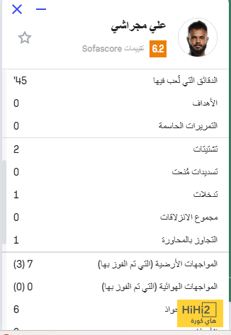 حصل علي مجرشي، لاعب النادي الأهلي، على تقييم ضعيف أمام الهلال في اللقاء الذي أُقيم اليوم الجمعة ضمن منافسات بطولة دوري روشن السعودي للمحترفين.