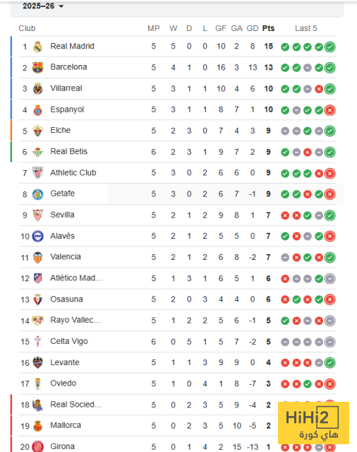 ريال مدريد بالنقاط الكاملة 15 نقطة، سجل 11 هدفا واستقبل هدفين.