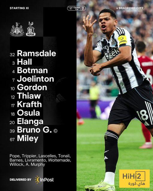 تشكيلة نيوكاسل الرسمية ضد برادفورد في كأس الرابطة الإنجليزية