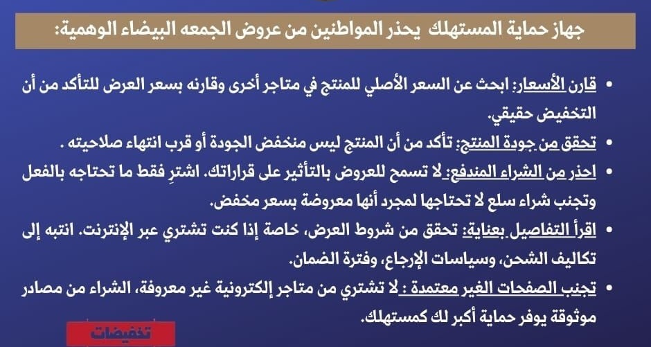 أكد الجهاز على ضرورة مقارنة أسعار المنتجات قبل الشراء، والتأكد من السعر الأصلي في متاجر أخرى لضمان أن التخفيض حقيقي وليس مضللاً.
