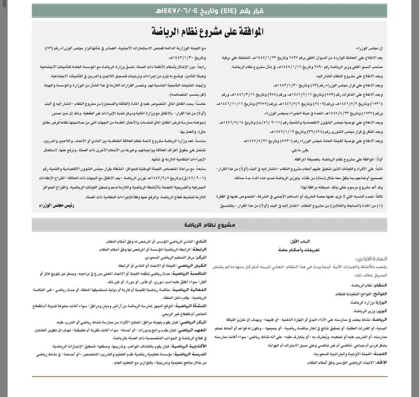 وافق مجلس الوزراء السعودي على قانون نظام الرياضة الجديد، والذي سيبدأ تطبيقه بعد 180 يومًا، ويضم 97 مادة تهدف إلى تنظيم القطاع الرياضي بشكل أكثر مهنية ورفع مستوى الشفافية.