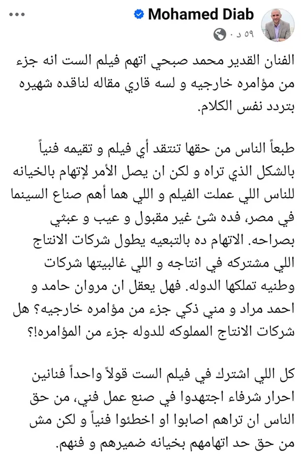 وقال محمد دياب، عبر حسابه الرسمي بفيسبوك: ‘الفنان القدير محمد صبحي اتهم فيلم الست بأنه جزء من مؤامرة خارجية، ولسه قاري مقالًا لناقدة شهيرة يردد نفس الكلام..طبعًا من حق الناس انتقاد أي فيلم وتقييمه فنيًا بالشكل الذي تراه، ولكن أن يصل الأمر إلى اتهام بالخيانة للناس اللي عملت الفيلم، واللي هما أهم صُنّاع السينما في مصر، فده شيء غير مقبول وعيب وعبثي بصراحة’.