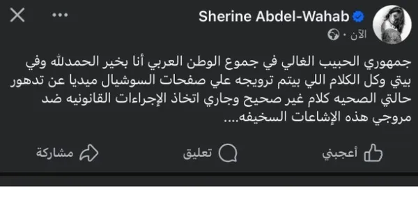 وأكدت شيرين، عبر حسابها الرسمي على موقع «فيسبوك»، أنها بصحة جيدة وتعيش حياتها بشكل طبيعي، نافيةً تمامًا صحة ما يتم تداوله على بعض الصفحات.