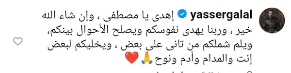 حرص الفنان ياسر جلال على دعم زميله الفنان مصطفى أبو سريع، بعد إعلان انفصاله عن زوجته، حيث وجّه له رسالة مباشرة عبر حسابه الرسمي على موقع إنستجرام.