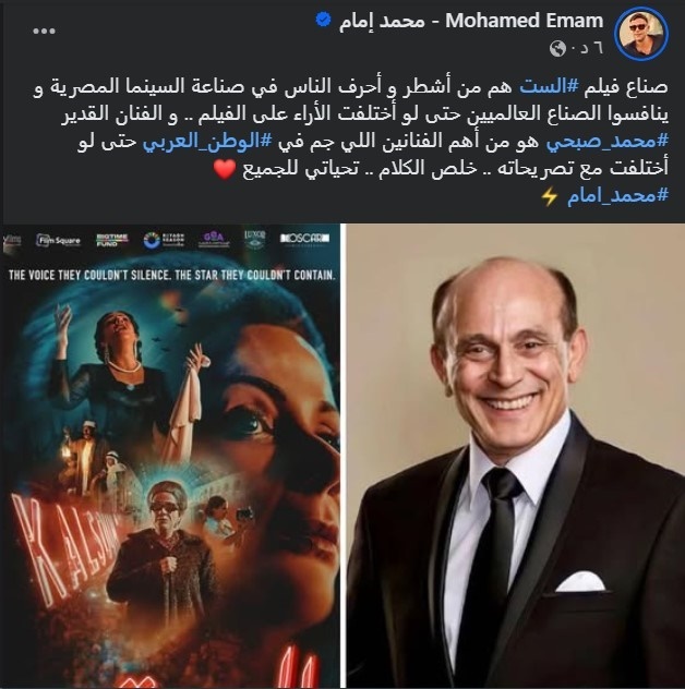 أشاد الفنان المصري محمد إمام بصناع فيلم “الست”، مؤكداً أنهم من أبرز صناع السينما المصرية الذين يمتلكون مهارات عالية وقدرة على المنافسة مع صناع السينما العالميين.