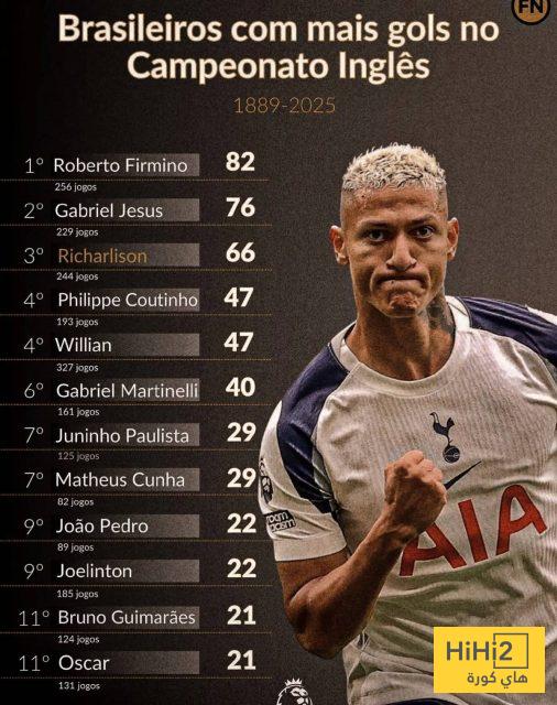 ريتشاليسون سجل اليوم هدفين في مباراة ناديه ضد بيرنلي في افتتاح الموسم الجديد للدوري الممتاز رافعا رصيده الى 66 هدفا بعدما خاض 244 مباراة في المسابقة .