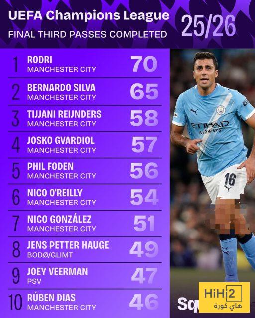 هاي كورة – في مشهد يعكس تفوقًا تكتيكيًا ساحقًا، بسط مانشستر سيتي سيطرته الكاملة على قائمة أكثر اللاعبين إتمامًا للتمريرات في الثلث الأخير من الملعب بدوري أبطال أوروبا هذا الموسم، حيث احتكر لاعبوه 8 مراكز من أصل أول 10 في هذه الإحصائية الدالة على مدى هيمنتهم الهجومية.