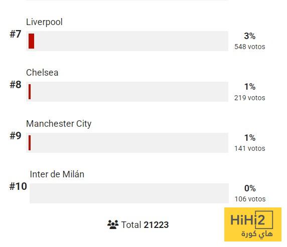 أما أتلتيكو مدريد، فقد نال دعمًا لافتًا من الجماهير الإسبانية، محققًا المركز الرابع بنسبة 10% (2036 صوتًا).