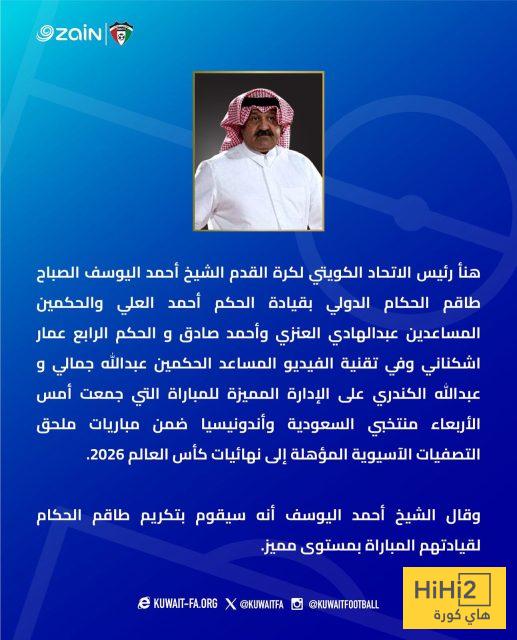 أوضح الاتحاد في بيانه أن الشيخ أحمد اليوسف، الرئيس، قدم التهنئة للعلي وطاقمه على المستوى المميز الذي ظهروا به خلال اللقاء، مؤكدًا اعتزازهم بالأداء التحكيمي الكويتي في المحافل القارية.